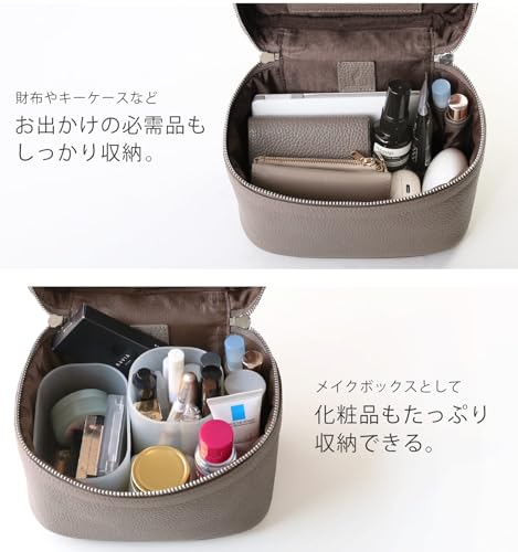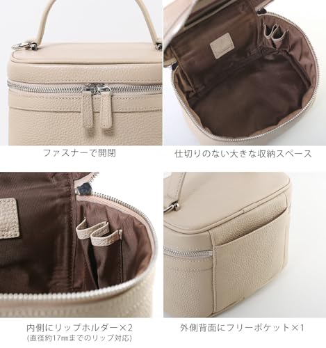 本革スピラレザー製の2wayバニティバッグは、お出かけにもおうちのメイクボックスにも最適。耐久性に優れ、ミラー付き。サイズはW19.5×H14×D13cm、約400g。リップホルダー2つとフリーポケット1つを備え、長く愛用できる逸品です。