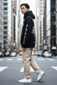 全身真っ黒はダサいので、クロムハーツのパーカーに白やグレーのパンツを合わせたり、小物(スニーカーやキャップ)に差し色を加えることでメリハリが生まれ、「おしゃれ」な印象になる。